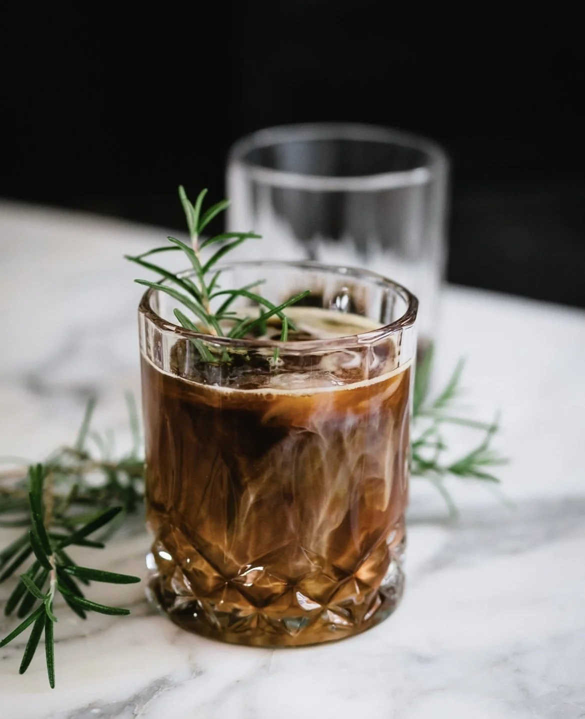 Pour cold brew in a glass over ice. Add 1-2 oz of rosemary syrup and the remaining ingredients to a cocktail shaker with more ice. Shake well to combine. Strain into the glass of cold brew and garnish with a sprig of rosemary.